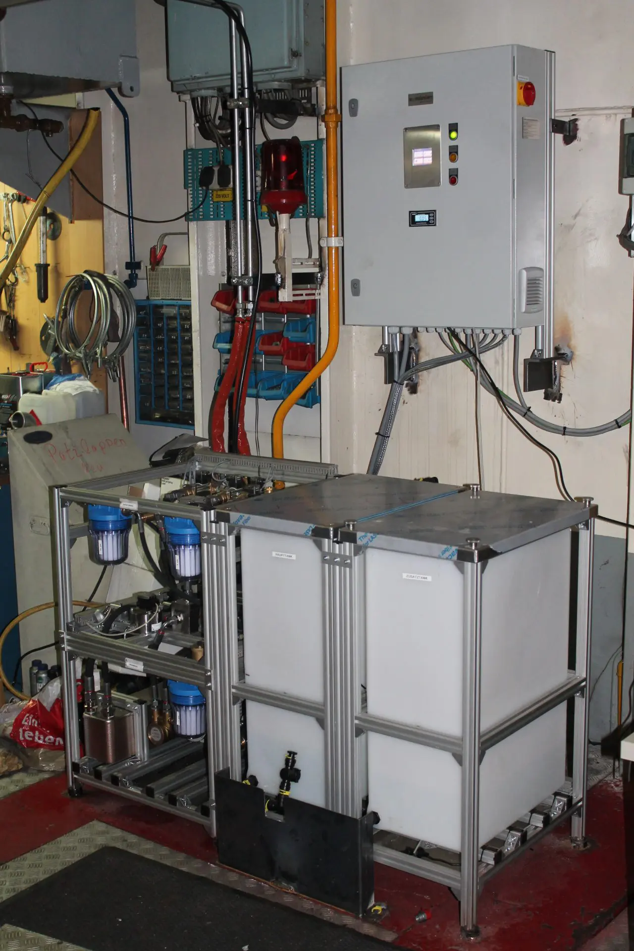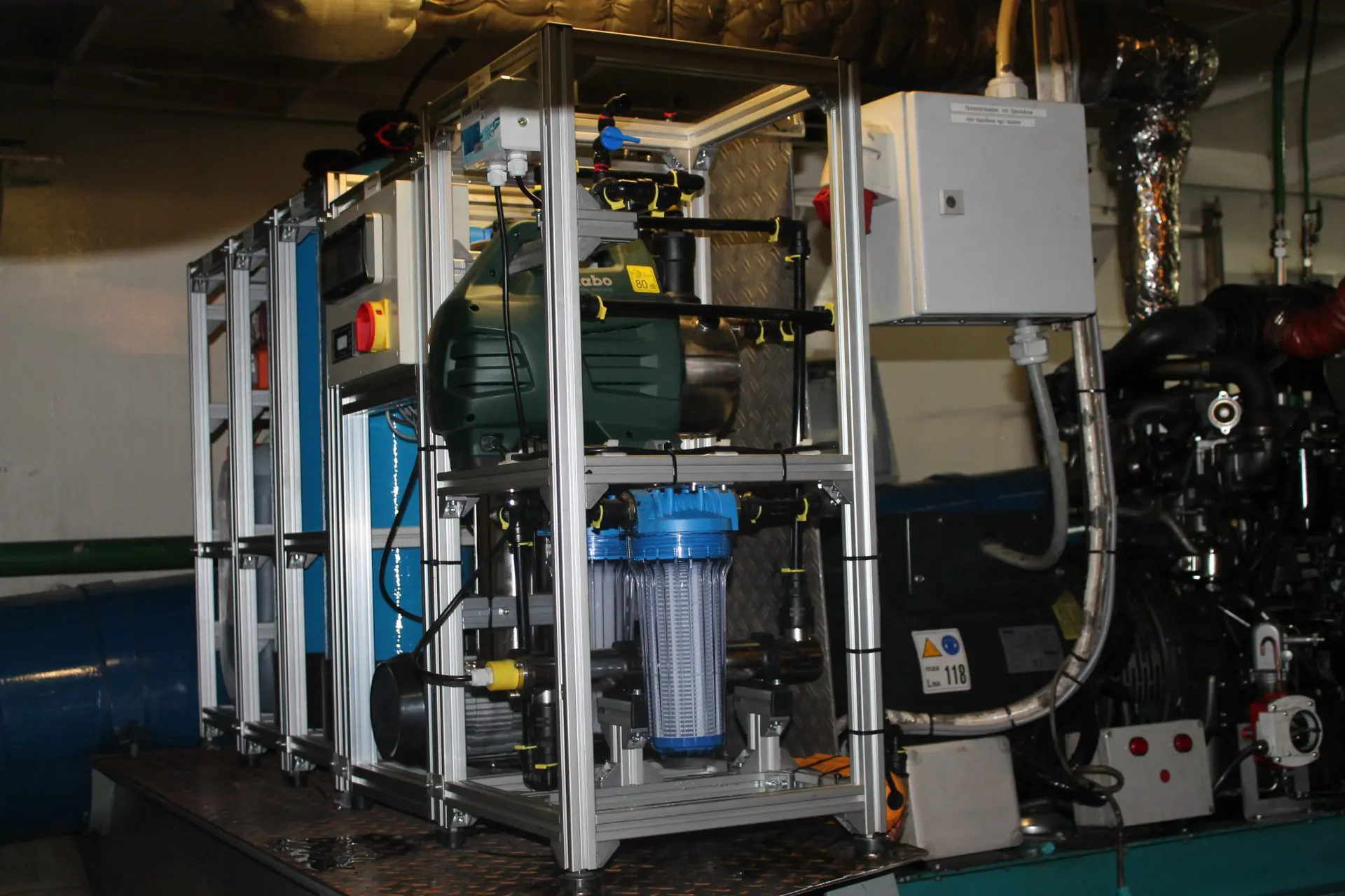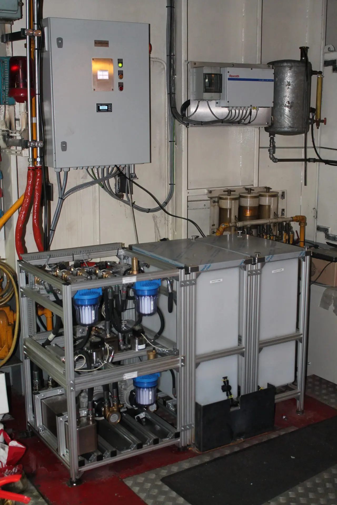 Das Binnenschiff MS Ralf Dieter, Baujahr 1972 hat einen Antriebsmotor CAT 3512B verbaut und fährt seit 2018 mit KWE. Die Hauptmodule mit den beiden Wassertanks konnten im Maschinenraum nebeneinander verbaut werden. Der Schaltschrank wurde darüber an der Wand montiert. Die Module der Prozesswasseraufbereitung haben erhöht Platz gefunden.