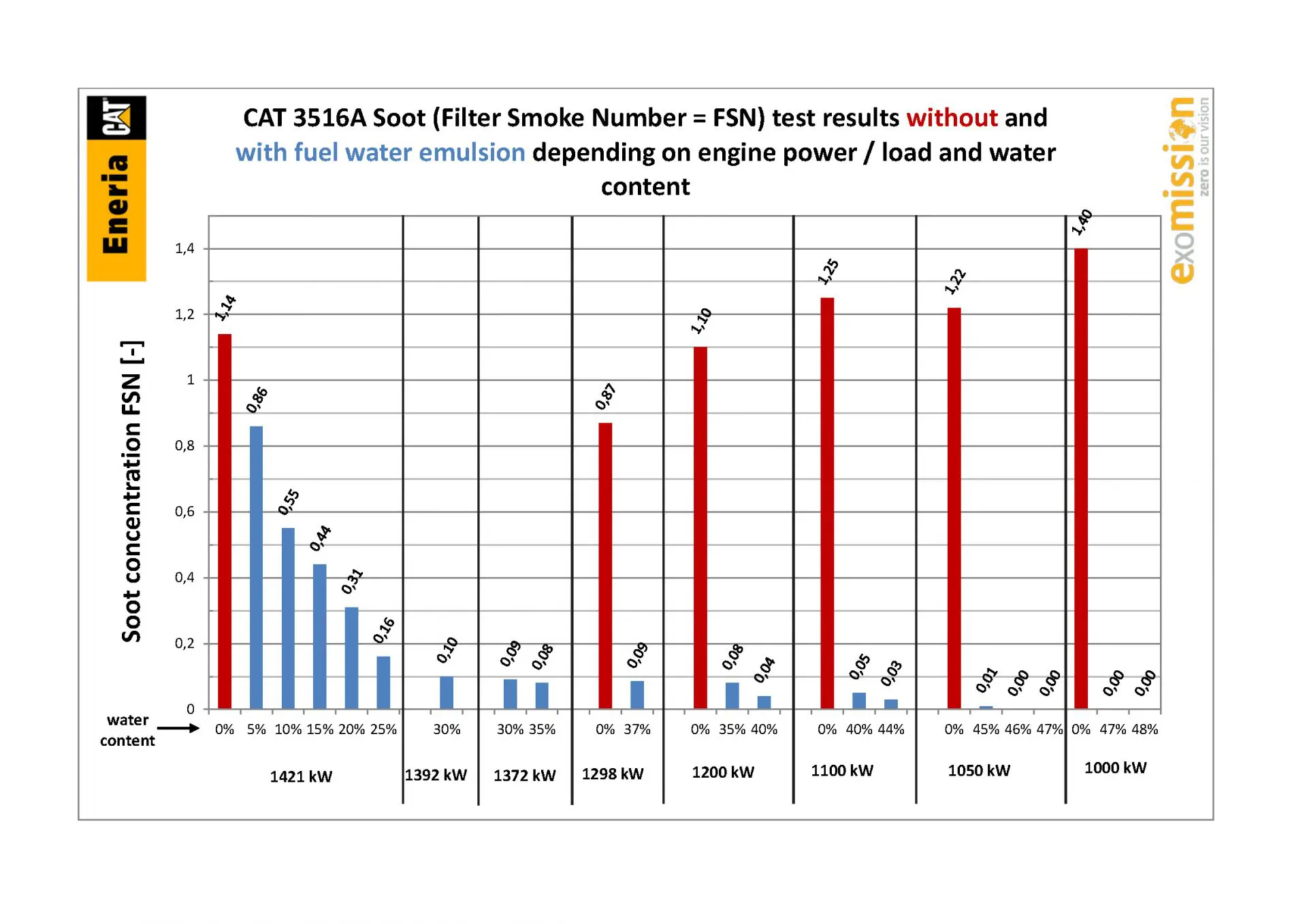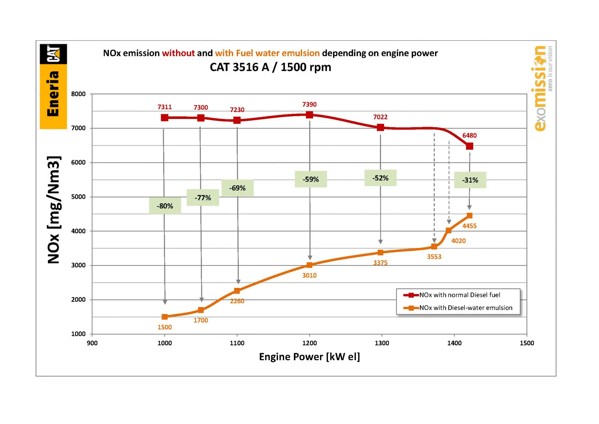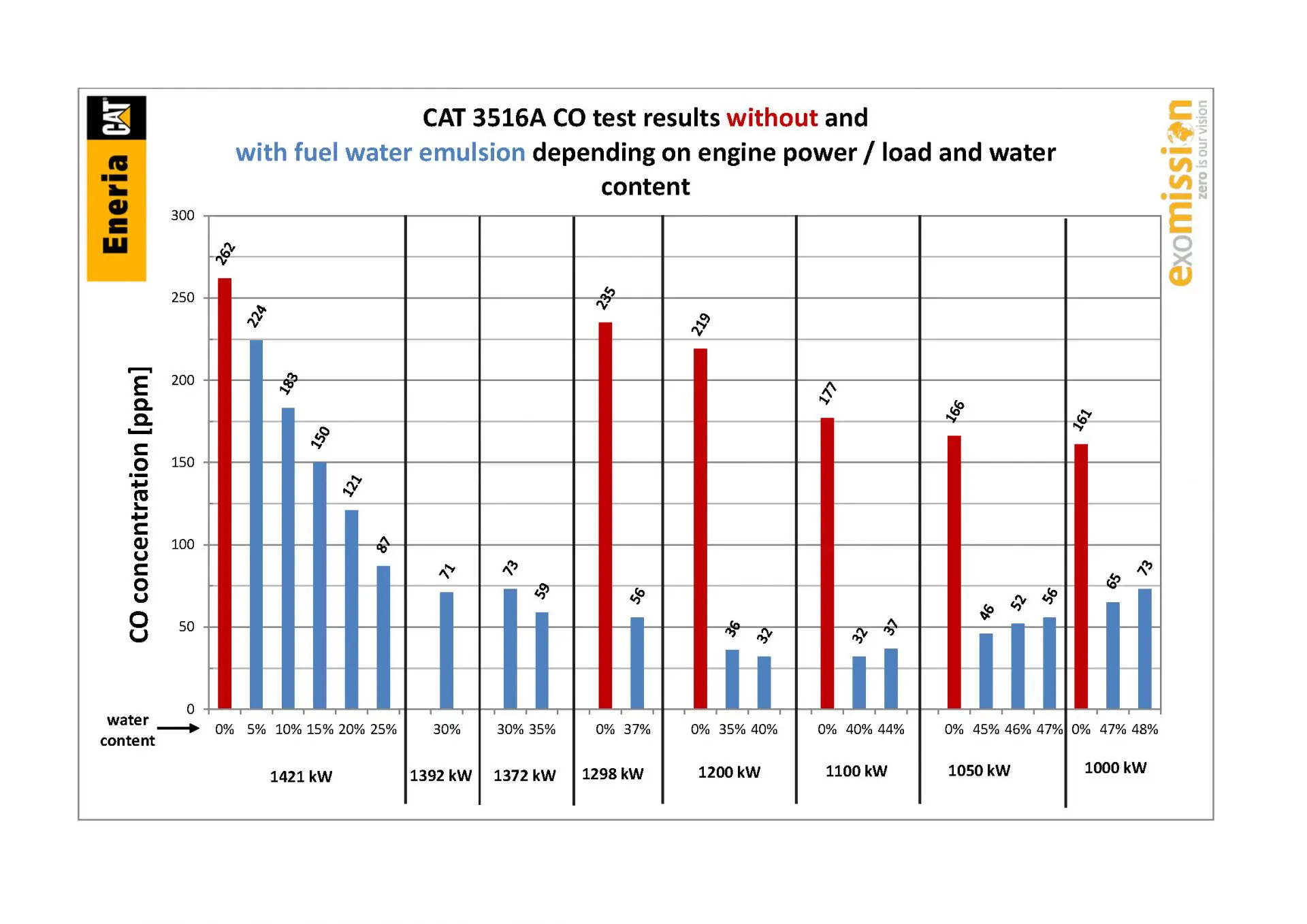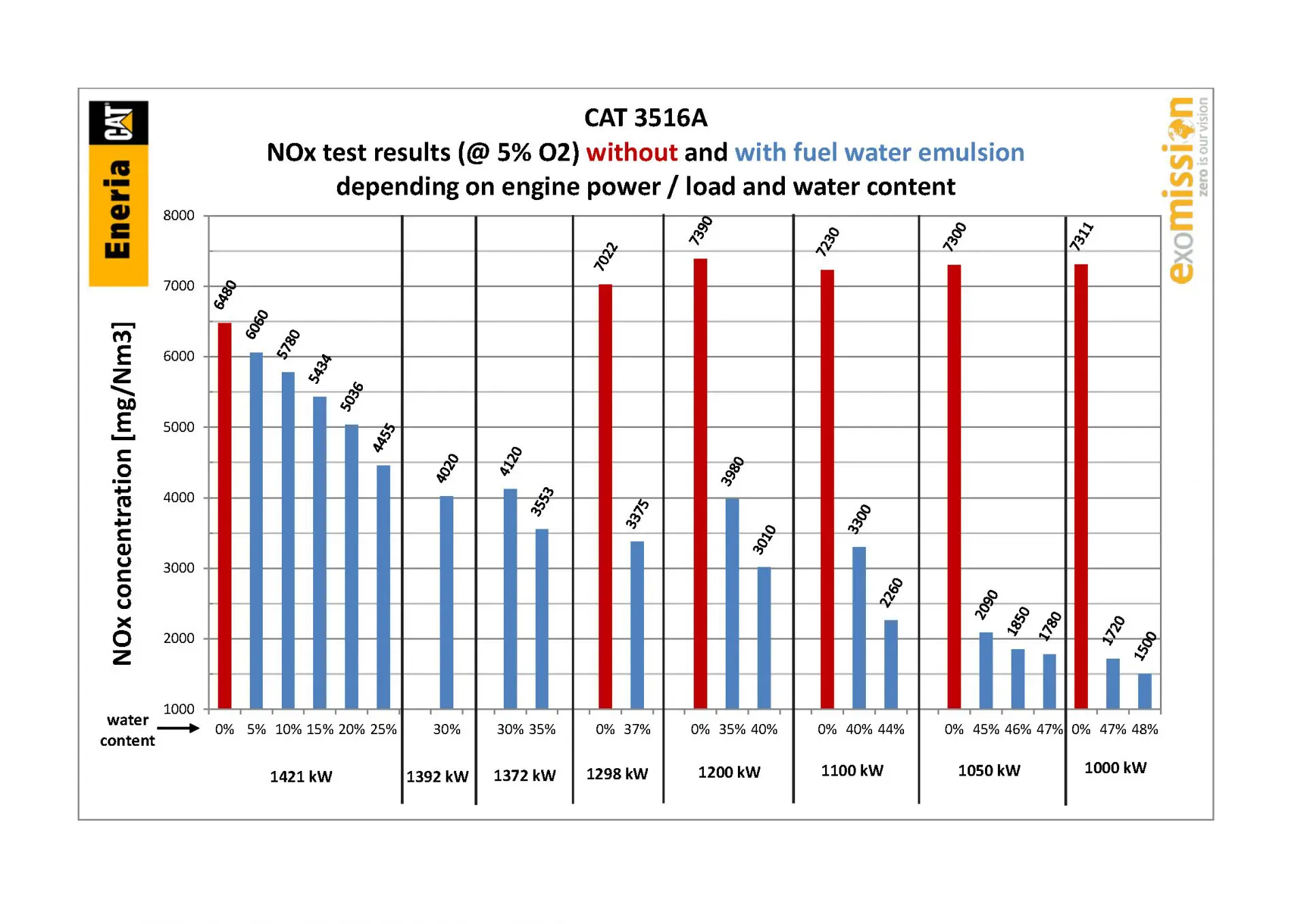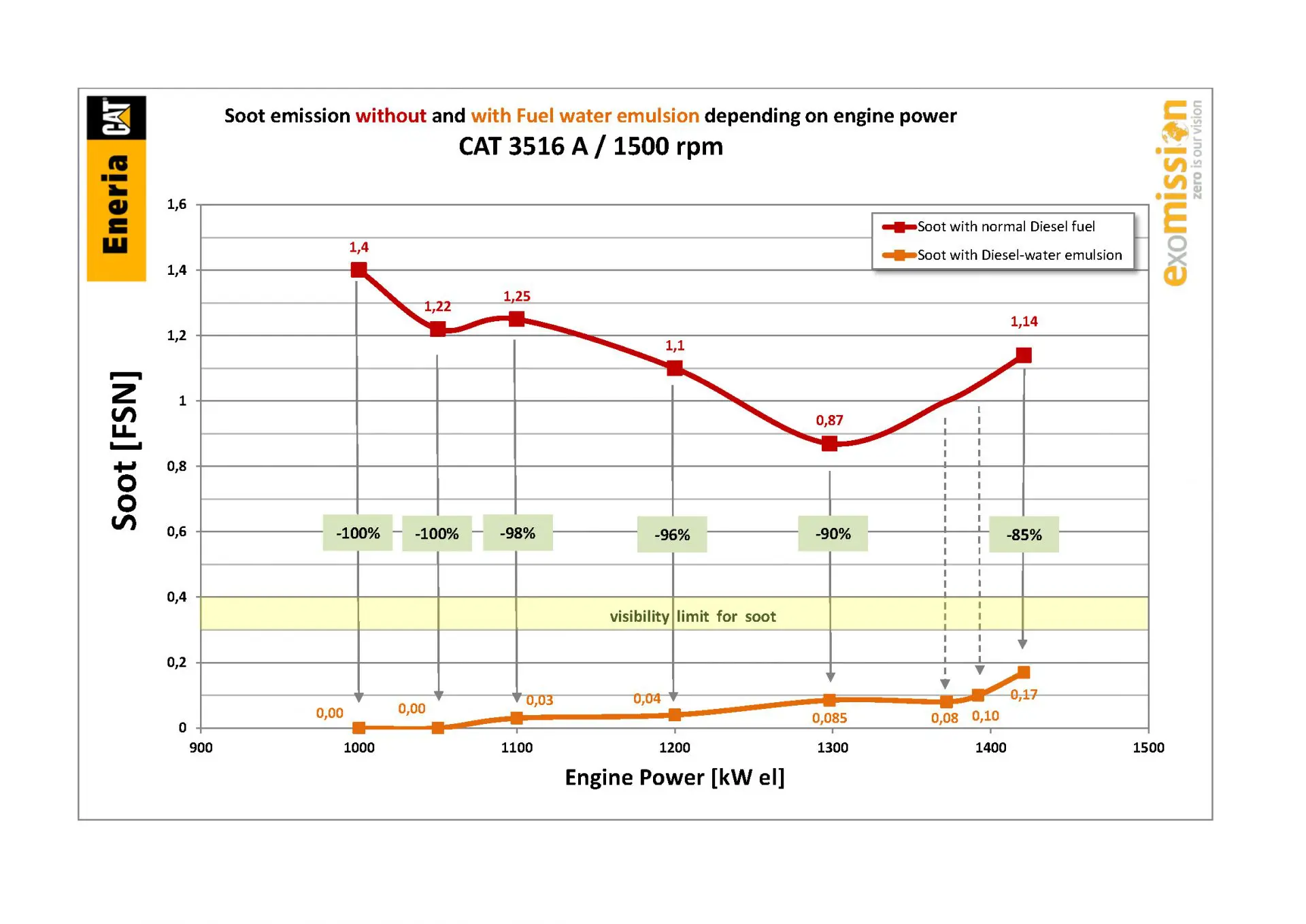 Auf Einladung des französischen CAT-Importeurs, der Firma ENERIA in Montlhéry Cedex, sollte an einem CAT3516A mit 1.492 kW aus dem Jahr 1992 untersucht werden, ob es möglich ist, mit KWE-Technik die NOx-Emissionen dieser Motoren unter den von dem französischen Energieversorgungsunternehmen EDF geforderten Wert von 2.000 mg/Nm3 zu bringen und parallel die Rußemissionen zu reduzieren. Die ausführlichen Versuche am Prüfstand von ENERIA südlich von Paris zeigten, dass dies durchaus möglich ist. Von ca. 7.000 mg/Nm3 NOx ausgehend konnte dargestellt werden, dass die NOx-Emissionen des Motors mit zunehmendem Wassergehalt in der Emulsion sukzessive reduziert werden, so dass in der Spitze eine NOx-Reduktion von 80% realisierbar war. Parallel waren die im Originalzustand sogar am Kamin sehr deutlich sichtbaren Rußemissionen schon bei mittleren Wassergehalten in der Emulsion nicht mehr sichtbar und konnten bis zur Nachweisgrenze (Reduktion > 99%) gebracht werden. Zusätzlich reduzierte der Emulsionsbetrieb auch die CO-Emissionen um 55 bis 85%.