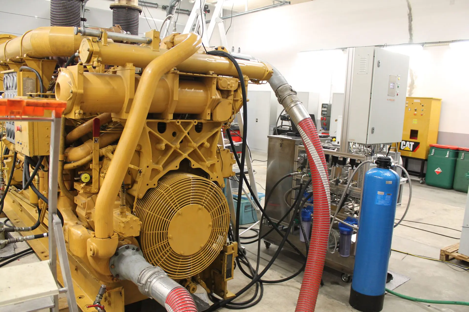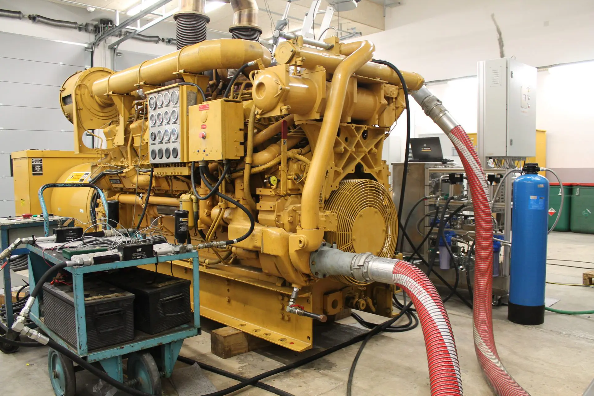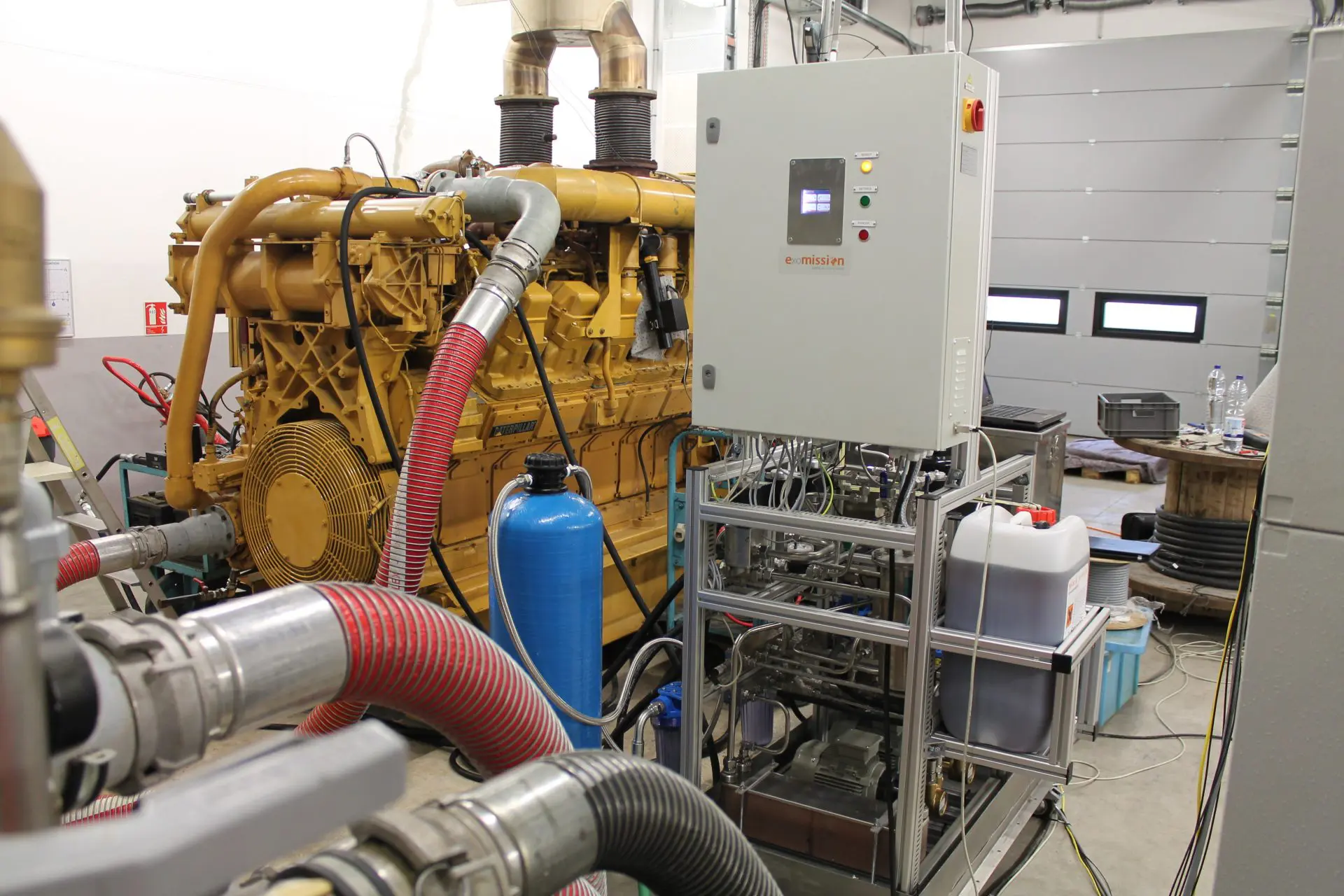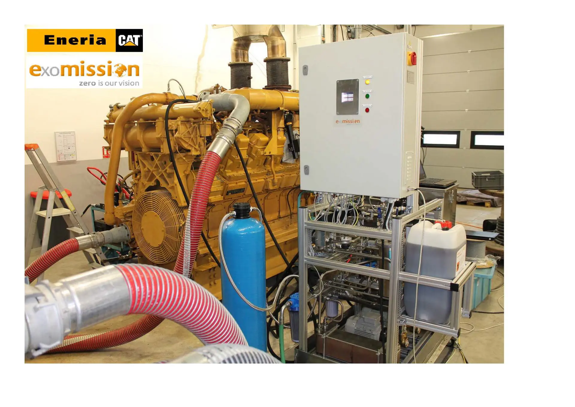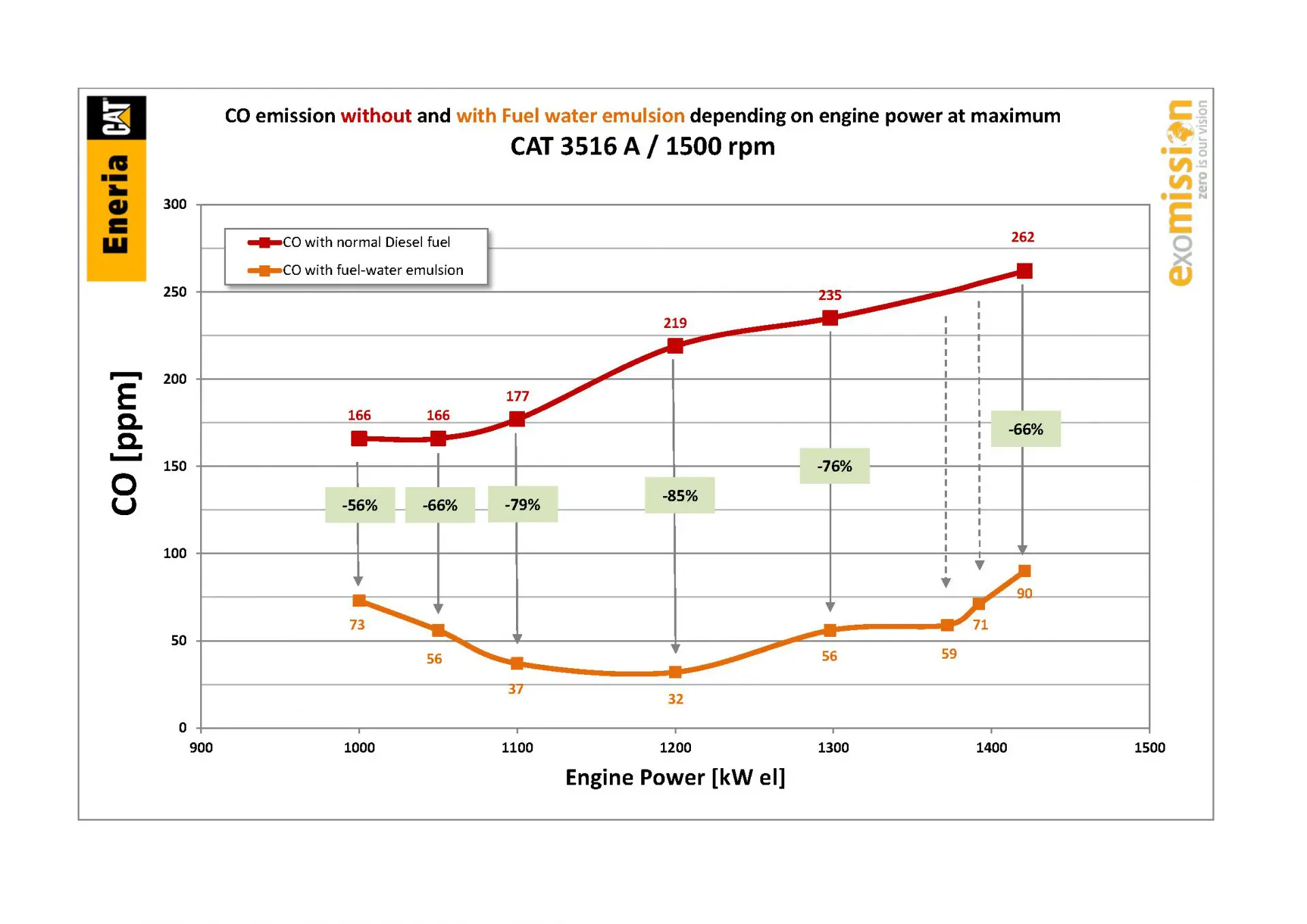 Auf Einladung des französischen CAT-Importeurs, der Firma ENERIA in Montlhéry Cedex, sollte an einem CAT3516A mit 1.492 kW aus dem Jahr 1992 untersucht werden, ob es möglich ist, mit KWE-Technik die NOx-Emissionen dieser Motoren unter den von dem französischen Energieversorgungsunternehmen EDF geforderten Wert von 2.000 mg/Nm3 zu bringen und parallel die Rußemissionen zu reduzieren. Die ausführlichen Versuche am Prüfstand von ENERIA südlich von Paris zeigten, dass dies durchaus möglich ist. Von ca. 7.000 mg/Nm3 NOx ausgehend konnte dargestellt werden, dass die NOx-Emissionen des Motors mit zunehmendem Wassergehalt in der Emulsion sukzessive reduziert werden, so dass in der Spitze eine NOx-Reduktion von 80% realisierbar war. Parallel waren die im Originalzustand sogar am Kamin sehr deutlich sichtbaren Rußemissionen schon bei mittleren Wassergehalten in der Emulsion nicht mehr sichtbar und konnten bis zur Nachweisgrenze (Reduktion > 99%) gebracht werden. Zusätzlich reduzierte der Emulsionsbetrieb auch die CO-Emissionen um 55 bis 85%.