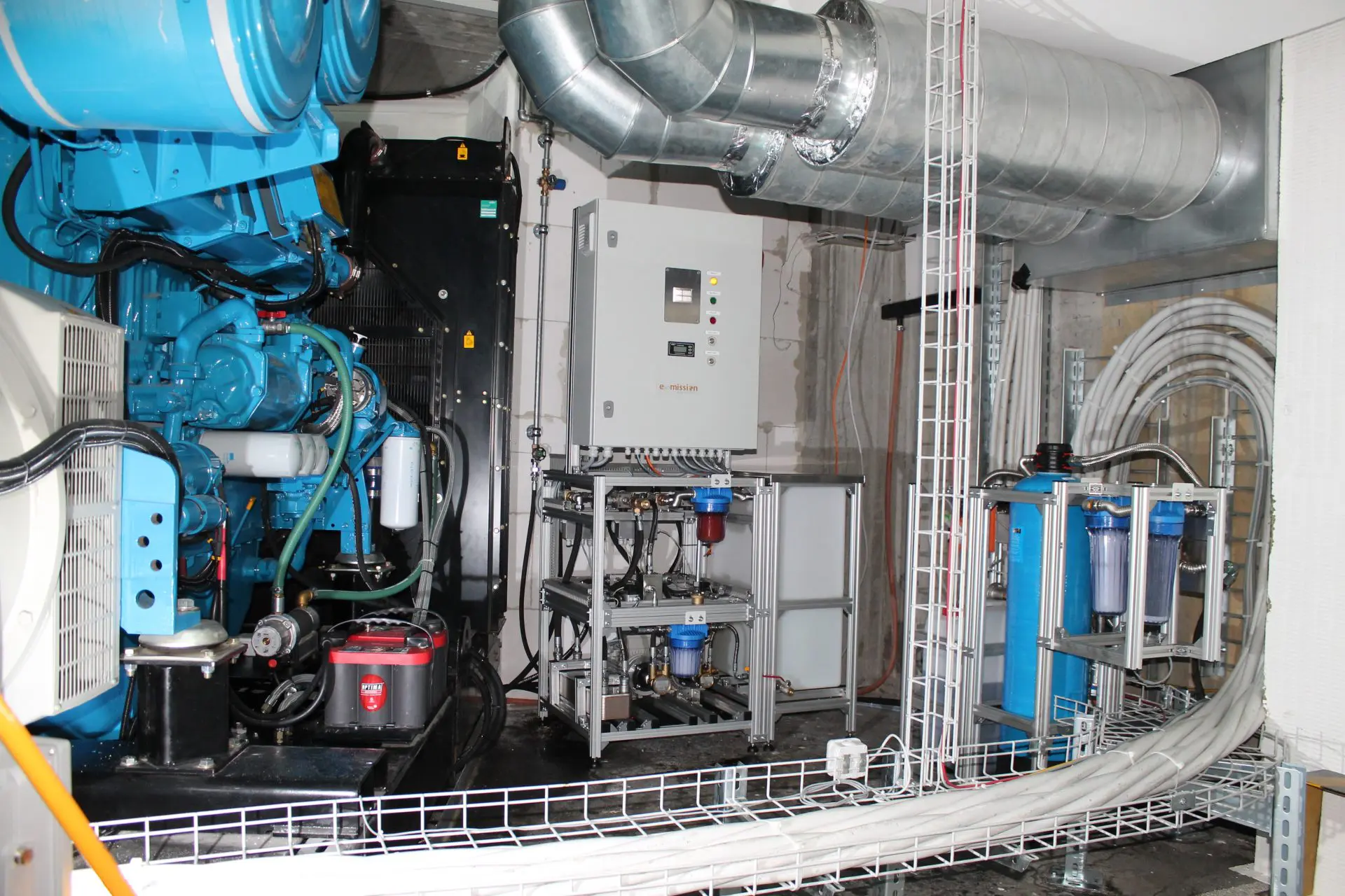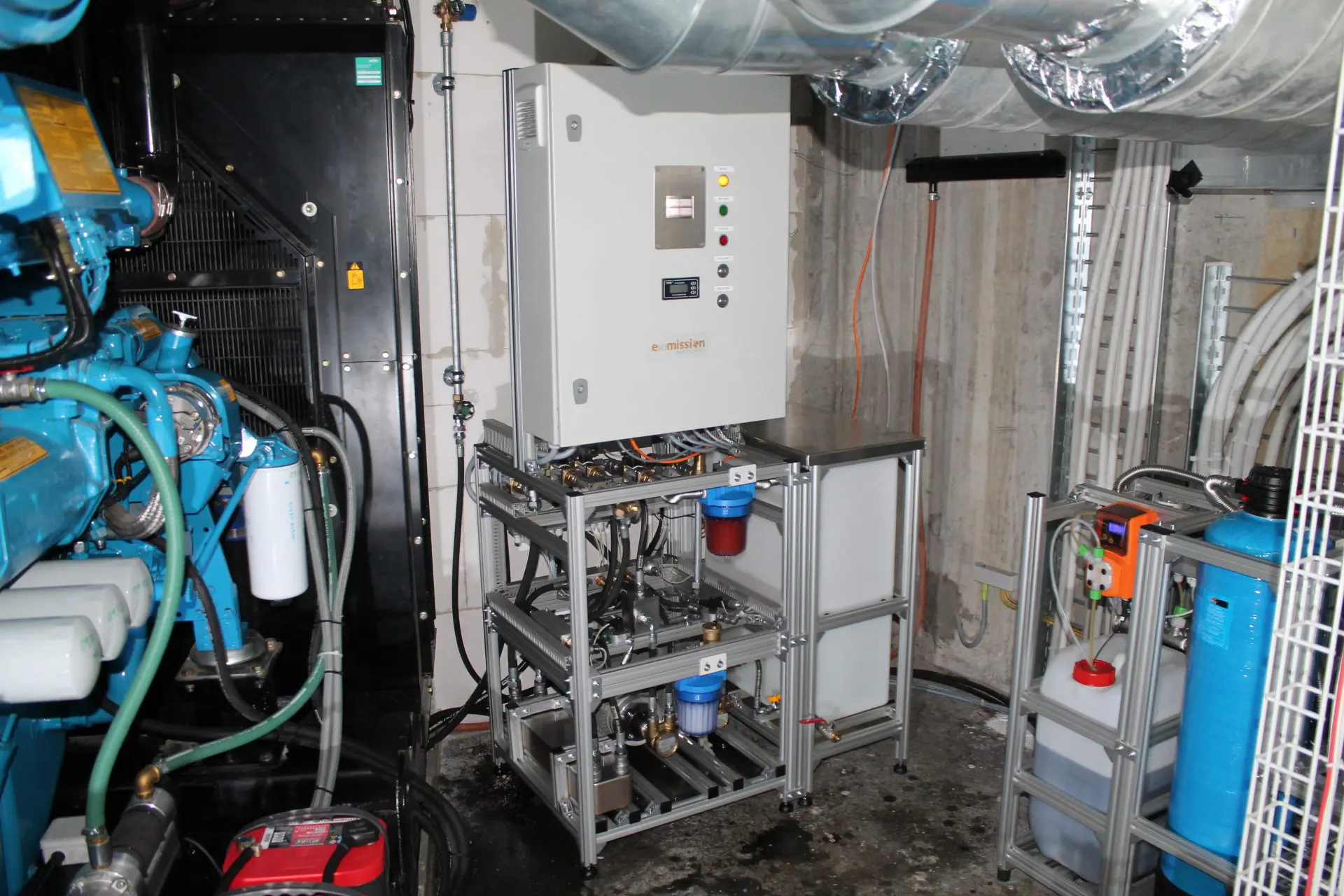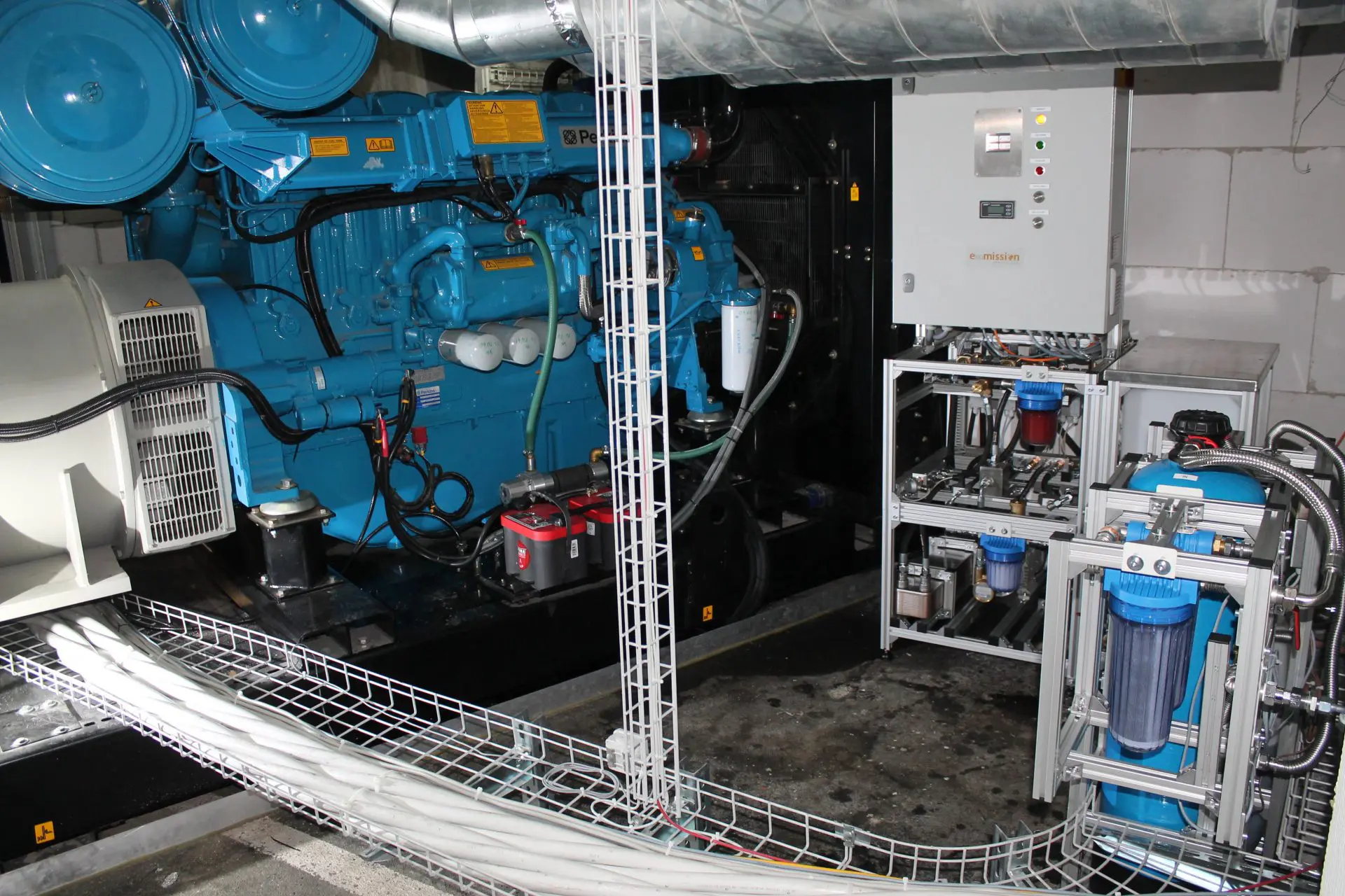 In einem Rechenzentrum der Firma NTS in Bern haben wir in Zusammenarbeit mit der Firma BIMEX AG ein Notstromaggregat Perkins 4006-23 TAG3A mit 800 kVA mit KWE ausgerüstet. Durch einen Vortest mit unserer mobilen KWE-Testanlage konnten wir den Kunden final überzeugen. Im Ergebnis wurden durch die KWE die Rußemissionen um 99% (Messbereichsgrenze) und die Stickoxidemissionen um 55 bis 70% reduziert. Weit mehr als erwartet und auch deutlich mehr als vom Gesetzgeber gefordert. Nach dem erfolgreichen Test kam der Auftrag umgehend. Der finale Einbau erfolgte ein paar Wochen später.