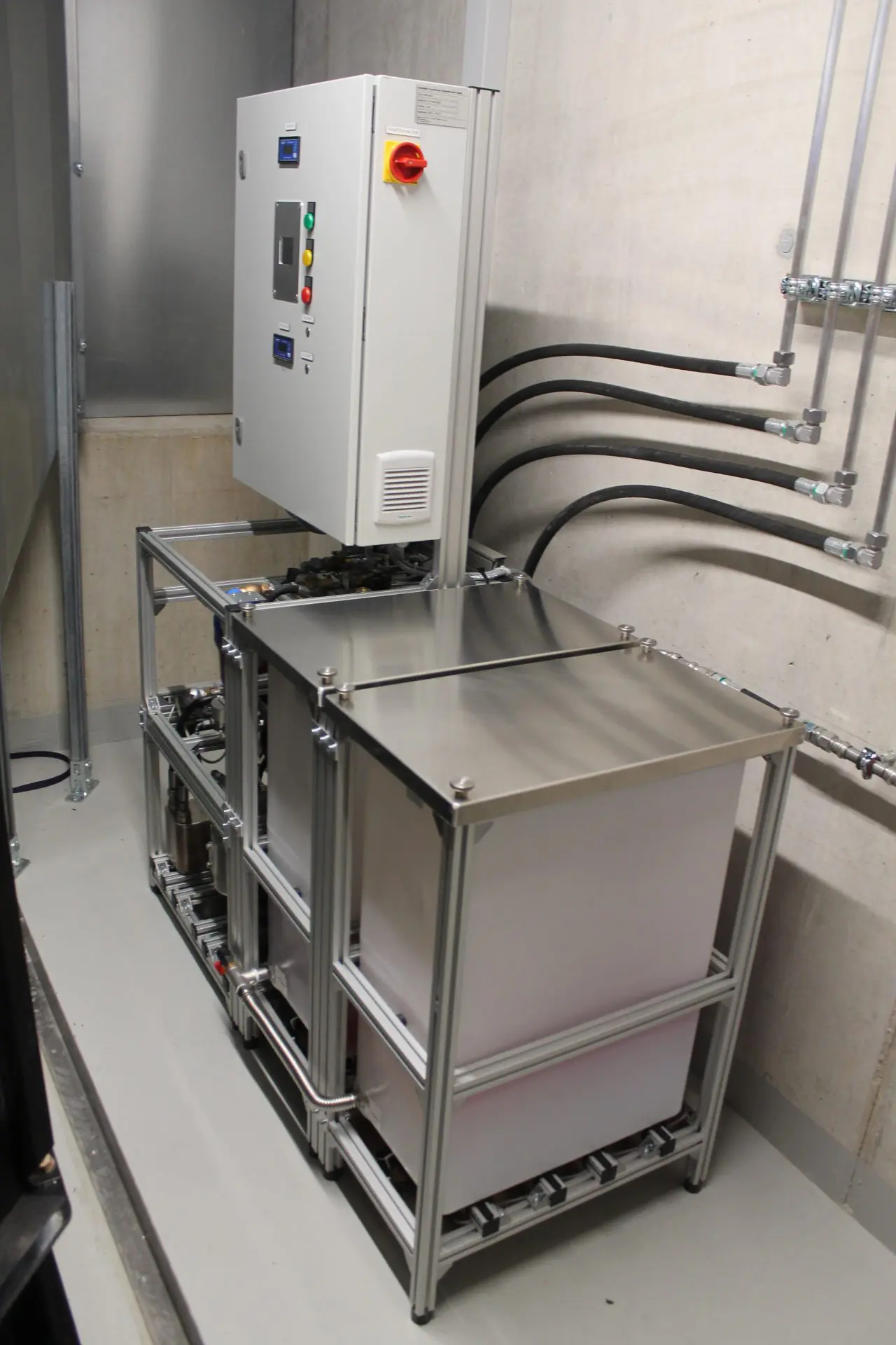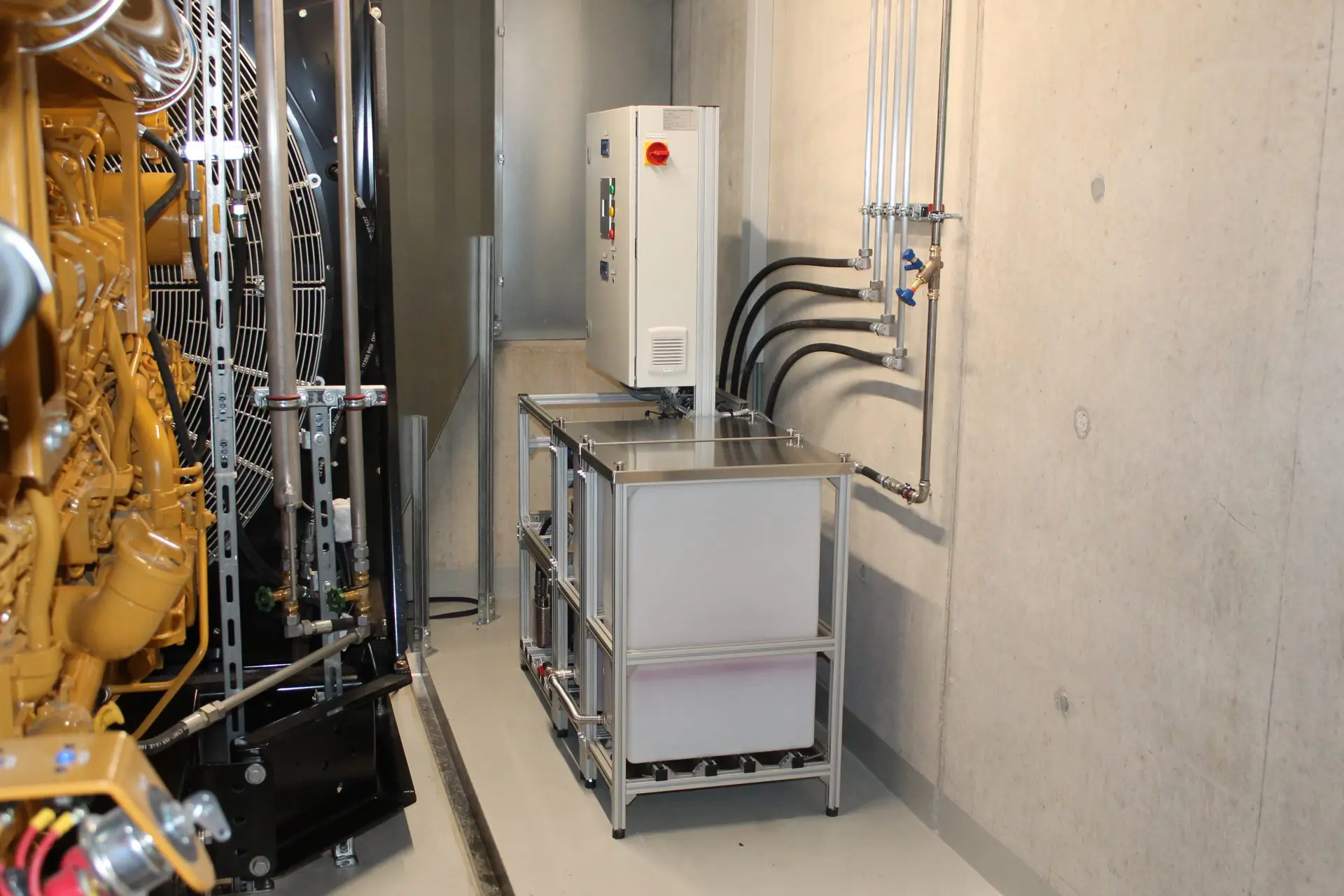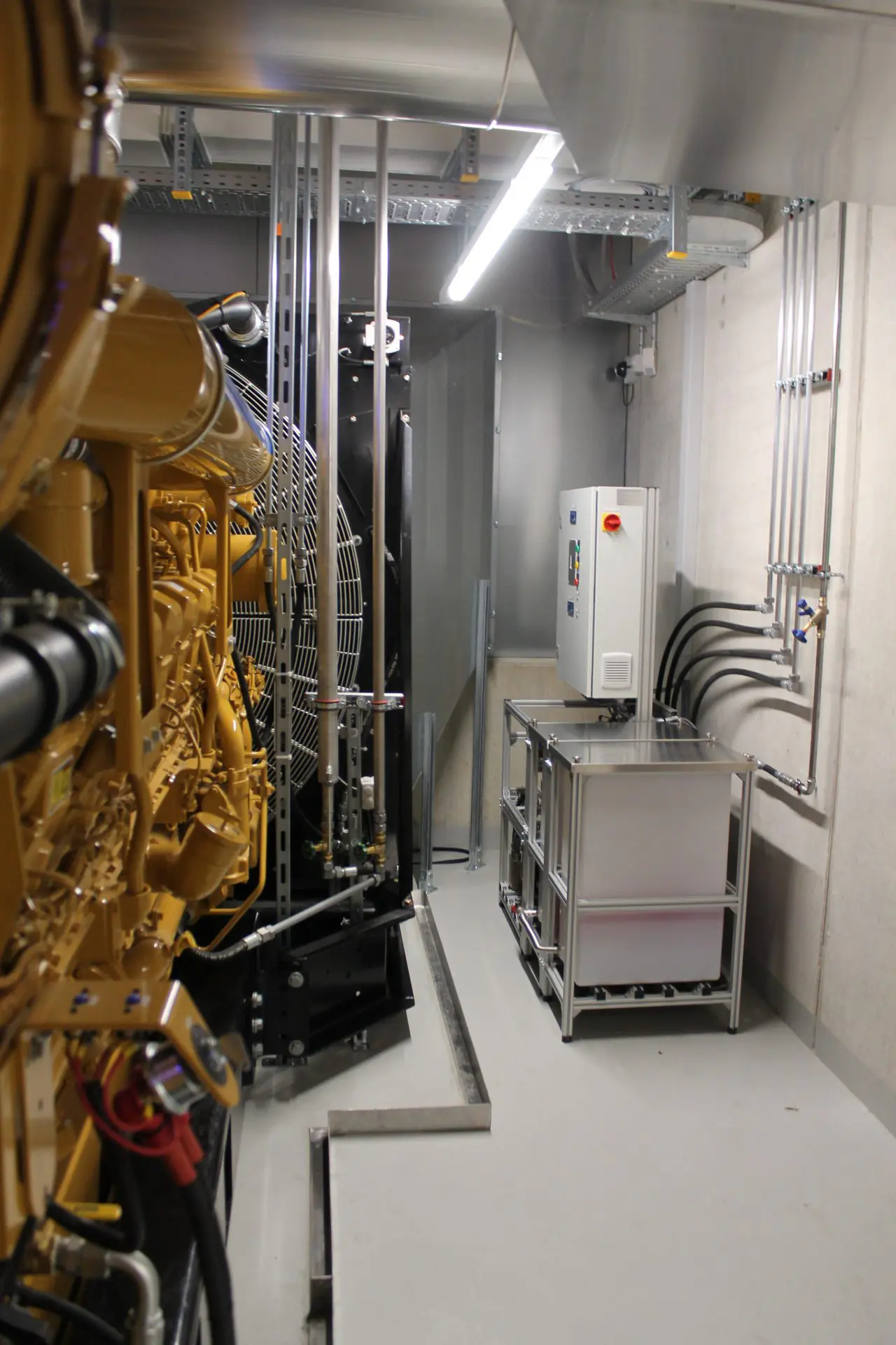 15 km von Sankt Gallen und 40 km von Bregenz am Bodensee entfernt liegt das Örtchen Gais im Appenzeller Land auf fast 1000 Meter Höhe, malerisch umgeben von Bergen und Wiesen. Am Rande des kleinen Gewerbegebiets von Gais erscheint auf einmal ein schwarzer Kubus – das RZO, das Rechenzentrum Ostschweiz. Ein beeindruckender Anblick mit grasenden Kühen und Bergen im Hintergrund. Im Keller des Hochsicherheitsgebäudes stehen zwei große CAT 3516B mit je 2000 kWe. Die beiden CAT-Motoren mussten in den NOx-Emissionen gesenkt werden. Kein Problem für die KWE-Technik. Im Auftrag unseres Partners AVESCO konnte in den offiziellen Messungen des Prüfinstitutes die NOx-Emissionen unter die Grenzwerte reduziert werden. Die bis dahin vorhandenen Partikelfilter konnten ausgebaut werden, da die Motoren mit KWE-Technik selbst die strengen Schweizer Staub- und Rußwerte von 5 mg/Nm3 locker unterschreiten. Das Prozesswasser für die beiden jeweils autark arbeitenden KWE-Anlagen wird aus auf dem Gebäudedach aufgefangenem Regenwasser erzeugt, welches auch die Server des innovativen und umweltfreundlichen Rechenzentrums kühlt.