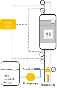 Schematischer Aufbau der mit Druckluft unterstützen Dosierung von AdBlue einer closed-loop NOx-Regelung des exomission SCR-Systems