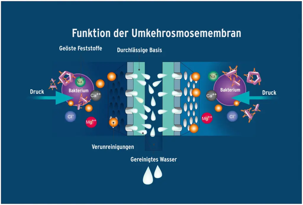 Nur reinstes Wasser tritt hindurch und bildet das sogenannte Permeat. Alle anderen (i.d.R. unerwünschten) Stoffe verbleiben hingegen auf der Rohwasserseite.